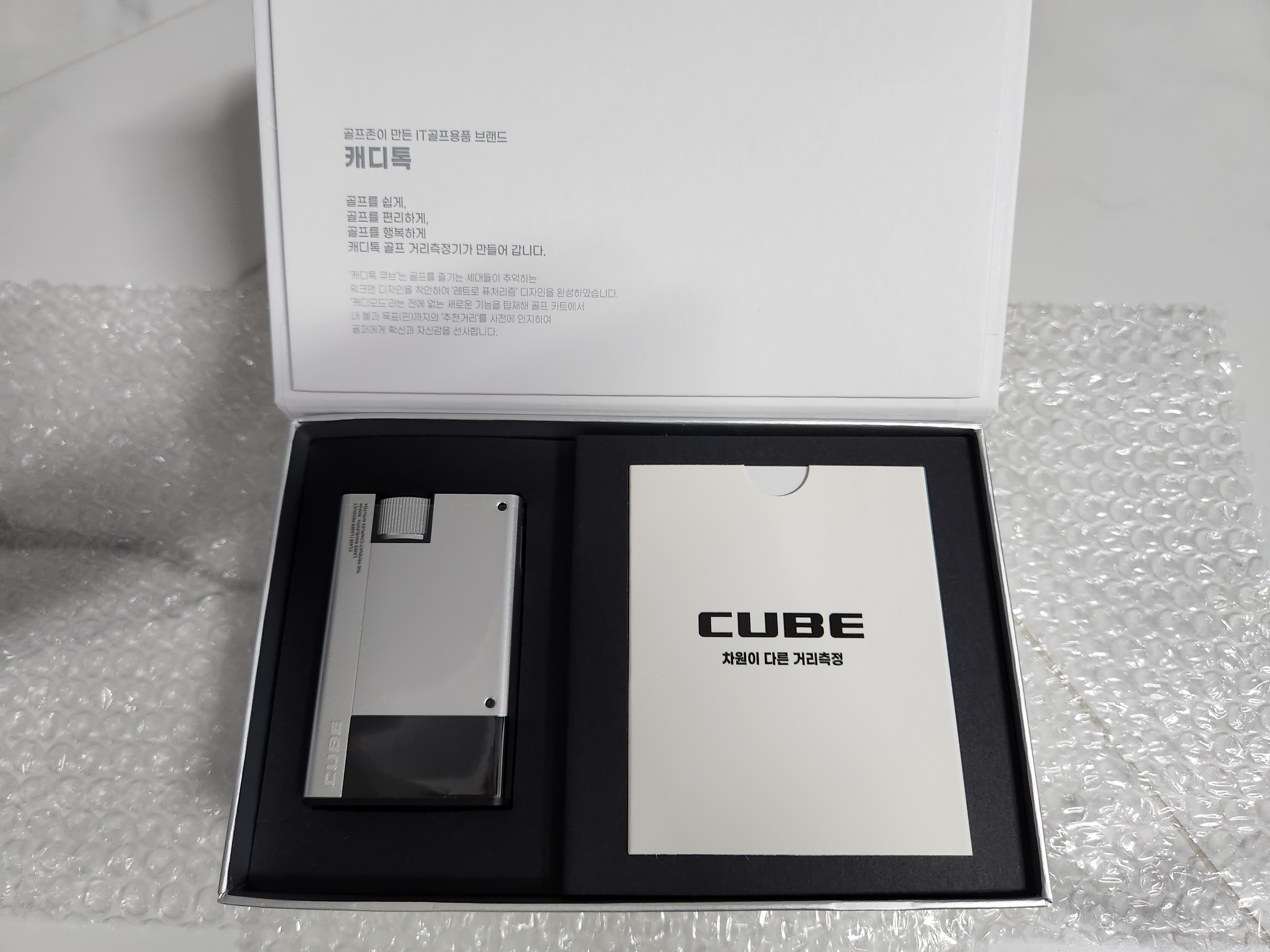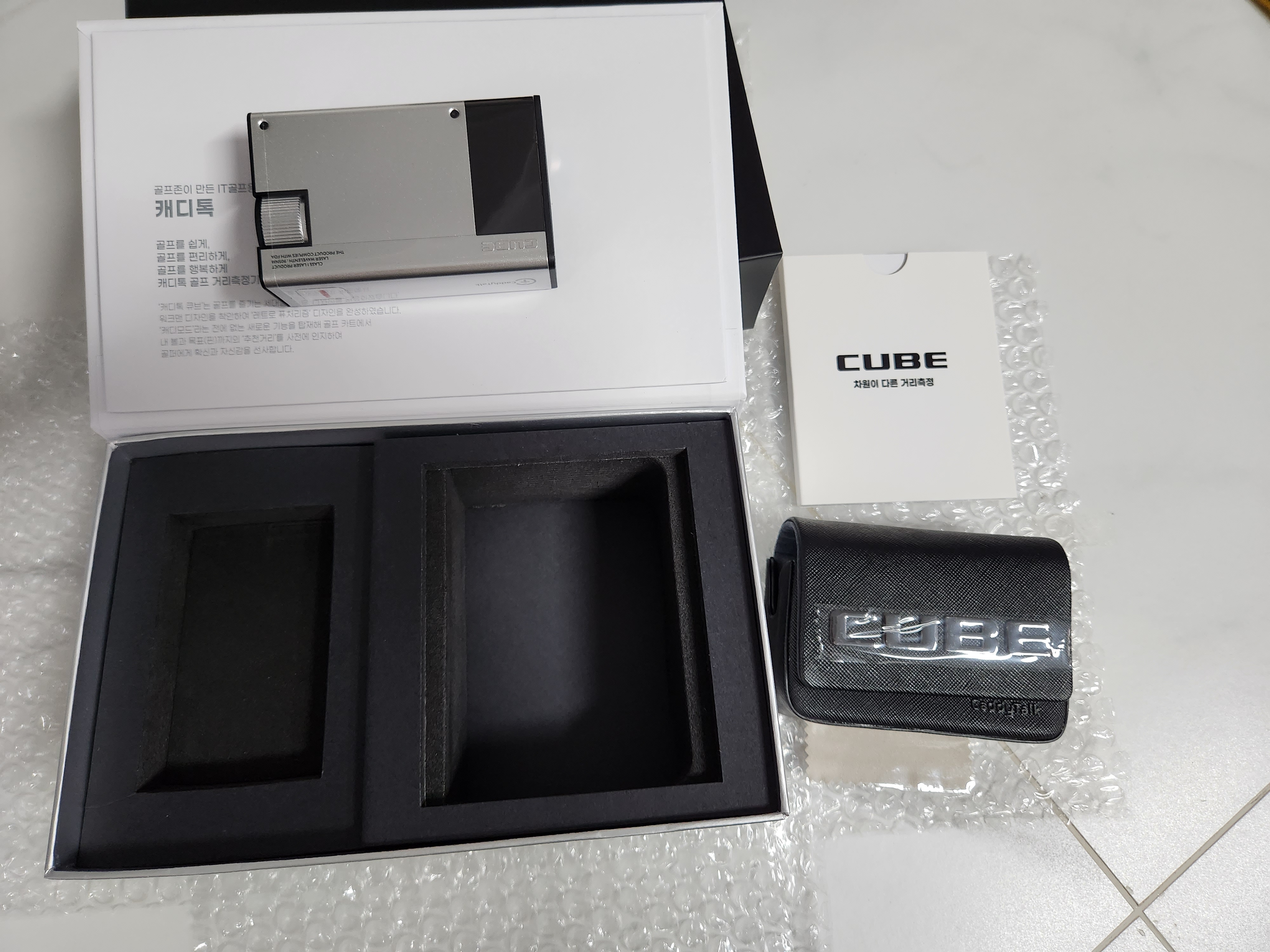 온 박스는 깔끔하고 이뻐 보였다. 하지만 포장이 조금 과대. 파우치도 귀여우리 만큼 작고 앙증 맞았다. 특히 캐디톡큐브는 그 크기가 꼭 장난감이 아닌가 할 정도로 작고 가벼웠다. 만약 크기와 무기, 디자인으로만 레이저거리측정기의 순위를 메긴다면 아마 1등이 아닐까 생각든다.