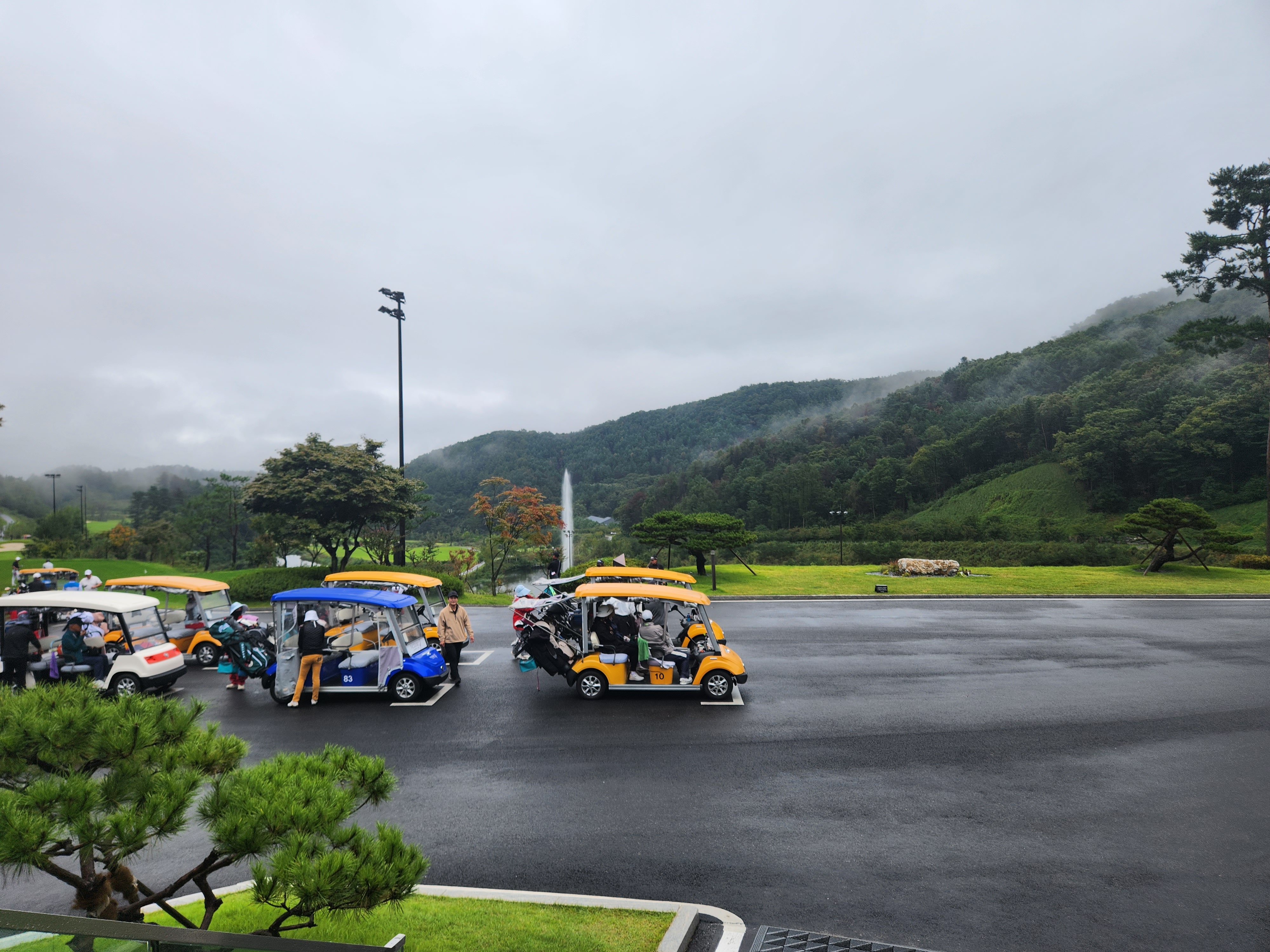 여유롭지 않은 시간탓에 클럽하우스를 제대로 둘러 보지 못하고 바로 스타트로 가 라운딩을 시작했다. 역시 비는 그칠줄 모르고 추적추적 내린탓에 우비와 우산을 준비. 드디어 첫 티샷을 하기 위해 힐코스 1번홀로 갔다. 오늘 라운딩은 힐코스로 출발 지코스로 마무리하기로 되어 있다. 휴코스는 담에..